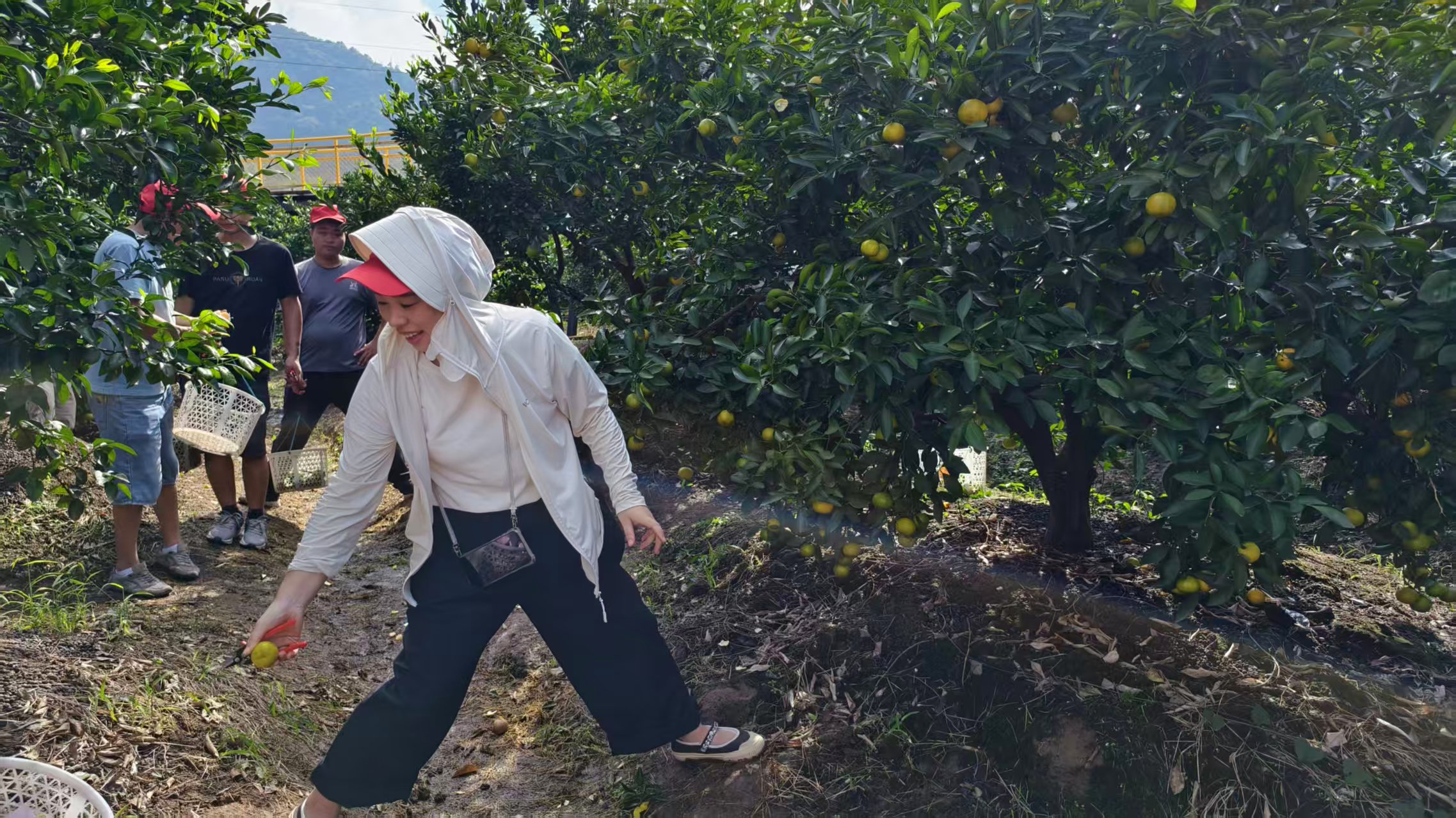 Istega dne so vsi zaposleni izvajali tudi dejavnosti obiranja v pomarančnem vrtu Huangyan in žetev je bila polna.